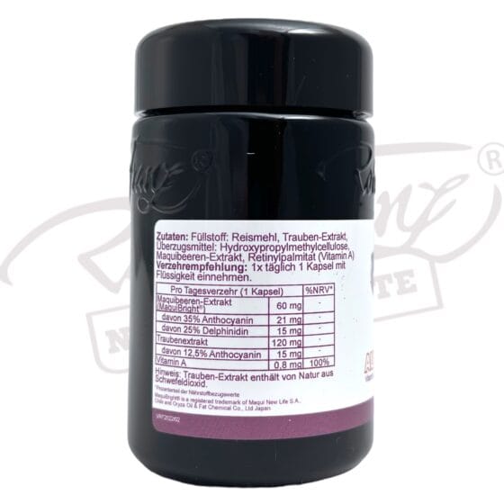 Inhaltsstoffe: Reismehl, Trauben-Extrakt, Überzugsmittel: Hydroxypropylmethylcellulose, Maqui-Beeren-Extrakt,Retinylpalmitat (Vitamin A)