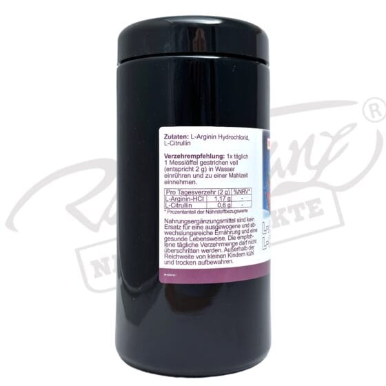 Inhaltsstoffe: 2g Pulver (Tagesverzehr) enthalten 1,17g L-Arginin-HCl und 0,6g L-Citrullin.