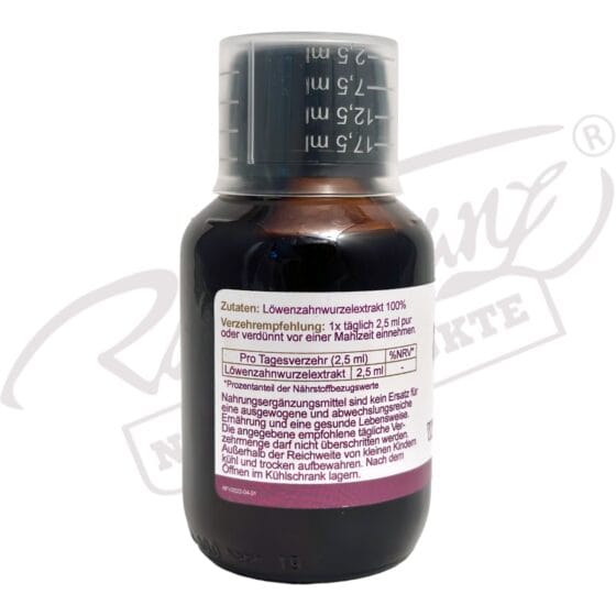 Inhaltsstoffe: 2,5 ml enthalten 2,5 ml Löwenzahnwurzel Extrakt. (= 0% NRV*)*Prozentsatz der Nährstoffbezugswerte (Nurtrient Reference Values) nach Verordnung (EU) Nr. 1169/2011
