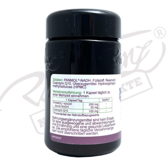 Pro Kapsel befinden sich 200 mg PANMOL®-NADH (= 0% NRV*) (davon NADH 20mg (= 0% NRV*)) und 100 mg Coenzym Q10 (= 0% NRV*). *Prozentsatz der Nährstoffbezugswerte (Nutrient Reference Values) nach Verordnung (EU) Nr. 1169/2011