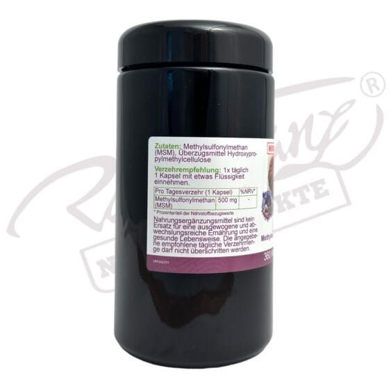 Inhaltsstoffe: Pro Kapsel befinden sich 500mg MSM (= 0% NRV*). Dieses Produkt enthält 99% reines Methylsulfonylmethan (MSM). * Prozentanteil der Nährstoffbezugswerte