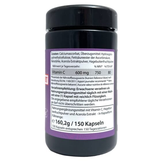 Inhaltsstoffe: Jede Kapsel enthält 600mg Vitamin C (= 750% NRV*)