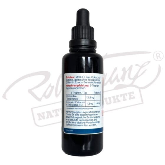 | Inhaltsstoffe | 5 Tropfen enthalten 12,5mg (= 0% NRV*) gemischte Tocopherole, entspricht Vitamin E (mg alpha-TE) 12mg (= 100% NRV*) *Prozentanteil der Nährstoffbezugswerte |